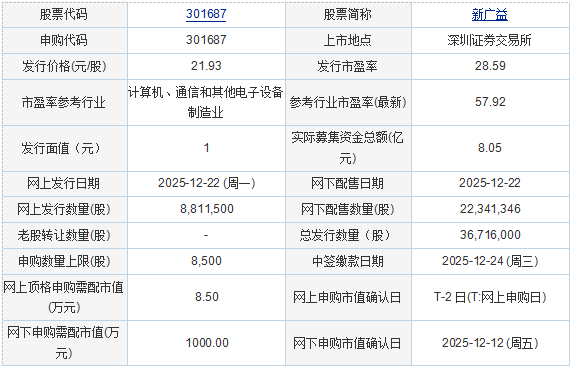 新广益2025年12月19日披露的首次公开发行股票并在创业板上市发行公告显示,按本次发行价格21.93元/股计算,预计募集资金总额为80,518.19万元,扣除发行费用约10,156.81万元(不含增值税)后,预计募集资金净额约为70,361.38万元。