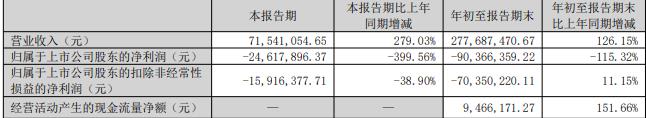 年初至报告期末,公司实现营业收入2.78亿元,同比增长126.15%;归属于上市公司股东的净利润-9036.64万元;扣除非经常性损益后的净利润-7035.02元;经营活动产生的现金流量净额946.62万元,同比增长151.66%。