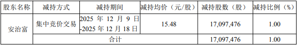 2025年12月9日至2025年12月18日,安治富通过集中竞价交易方式减持17,097,476股,减持比例1.00%,减持均价15.48元/股。经计算,安治富减持总金额为2.65亿元。