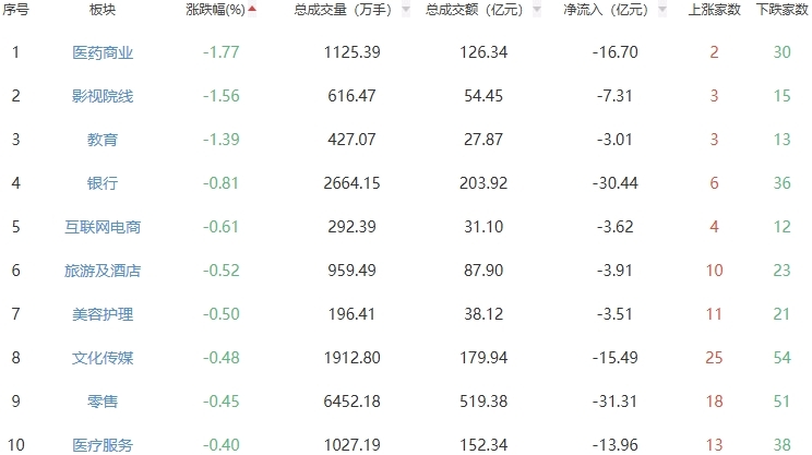 板块方面,贵金属、元件、电机等板块涨幅居前,医药商业、影视院线、教育等板块跌幅居前。