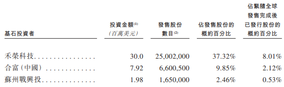 明基医院的基石投资者为禾荣科技、合富(中国)、苏州战兴投。其中,合富(中国)为一家于中国成立的股分有限公司,且于上海证券交易所上市(股票代码:603122)。