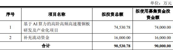 本次向特定对象发行股票募集资金总额不超过90,000.00万元(含本数),扣除发行费用后的净额拟投资于基于AI算力的高阶高频高速覆铜板研发及产业化项目、补充流动资金。