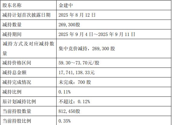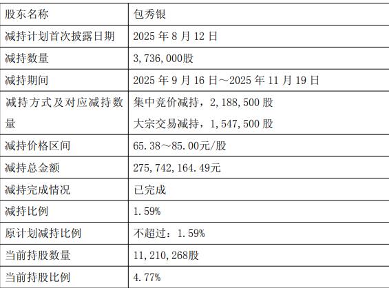 公司12月3日披露实际控制人之一兼董事长及监事减持股份计划时间届满暨减持结果公告,2025年8月12日,公司披露了《公司实际控制人之一兼董事长及监事减持股份计划公告》,该减持计划涉及2名股东,包秀银拟通过集中竞价及大宗交易的方式合计减持所持有的公司股份数量不超过3,736,000股,占公司总股本的比例不超过1.59%;股东金建中拟通过集中竞价的方式减持所持有的公司股份数量不超过270,000股,占公司总股本的比例不超过0.12%。本次减持自减持计划公告披露之日起15个交易日后的3个月内实施。截至公告披露日,本次减持计划时间届满,包秀银通过集中竞价及大宗交易方式累计减持公司股份 3,736,000股,占公司总股本的1.59%,减持计划已完成。金建中通过集中竞价累计减持公司股份269,300股,占公司总股本的0.11%,剩余700股未完成减持。包秀银及金建中减持金额共计293483302.82元。