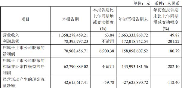 据公司2025年第三季度报告,本报告期,公司实现营业收入13.58亿元,同比增长63.04%;归属于上市公司股东的净利润7090.85万元;扣除非经常性损益后的净利润6279.09万元。