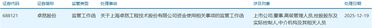 中国经济网北京12月23日讯 上交所网站于12月19日公布关于上海卓然工程技术股份有限公司(以下简称“卓然股份”,688121.SH)资金使用相关事项的监管工作函,涉及对象为上市公司、董事、高级管理人员、控股股东及实际控制人、中介机构及其相关人员。