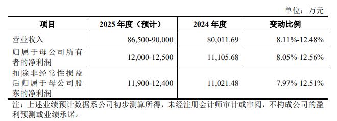 天溯计量预计2025年实现营业收入86,500万元至90,000万元,同比增长8.11%至12.48%;归属于母公司所有者的净利润12,000万元至12,500万元,同比增长8.05%至12.56%;扣除非经常性损益后归属于母公司股东的净利润11,900万元至12,400万元,同比增长7.97%至12.51%。