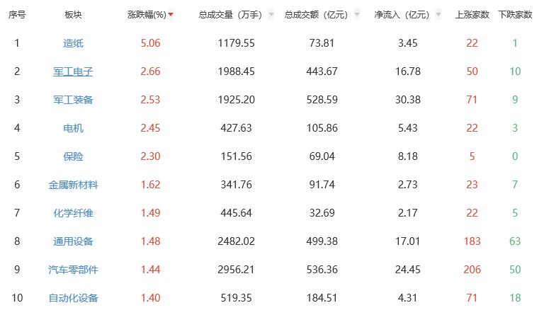 板块方面,造纸、军工电子、军工装备、电机等涨幅居前,能源金属、贵金属、小金属、工业金属等跌幅居前。