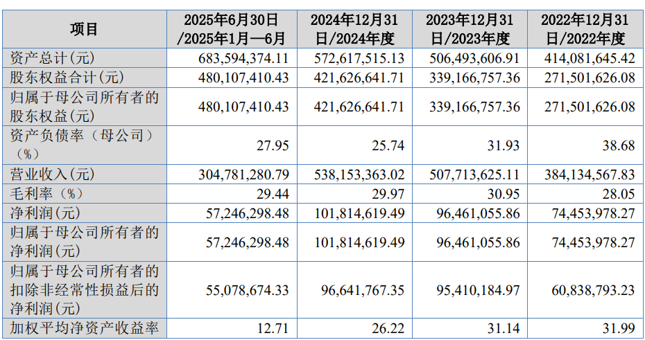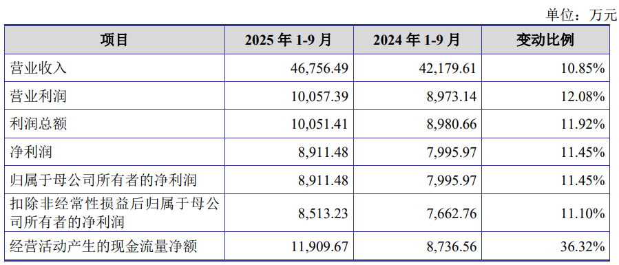2025年1-9月,公司实现营业收入46,756.49万元,同比增长10.85%;净利润/归属于母公司所有者的净利润为8,911.48万元,同比增长11.45%;扣除非经常性损益后归属于母公司所有者的净利润8,513.23万元,同比增长11.10%;经营活动产生的现金流量净额为11,909.67万元,同比增长36.32%。