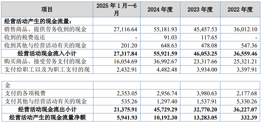上述同期,公司销售商品、提供劳务收到的现金分别为36,012.10万元、45,457.53万元、55,181.93万元;经营活动产生的现金流量净额分别为332.39万元、13,283.05万元、10,192.30万元。