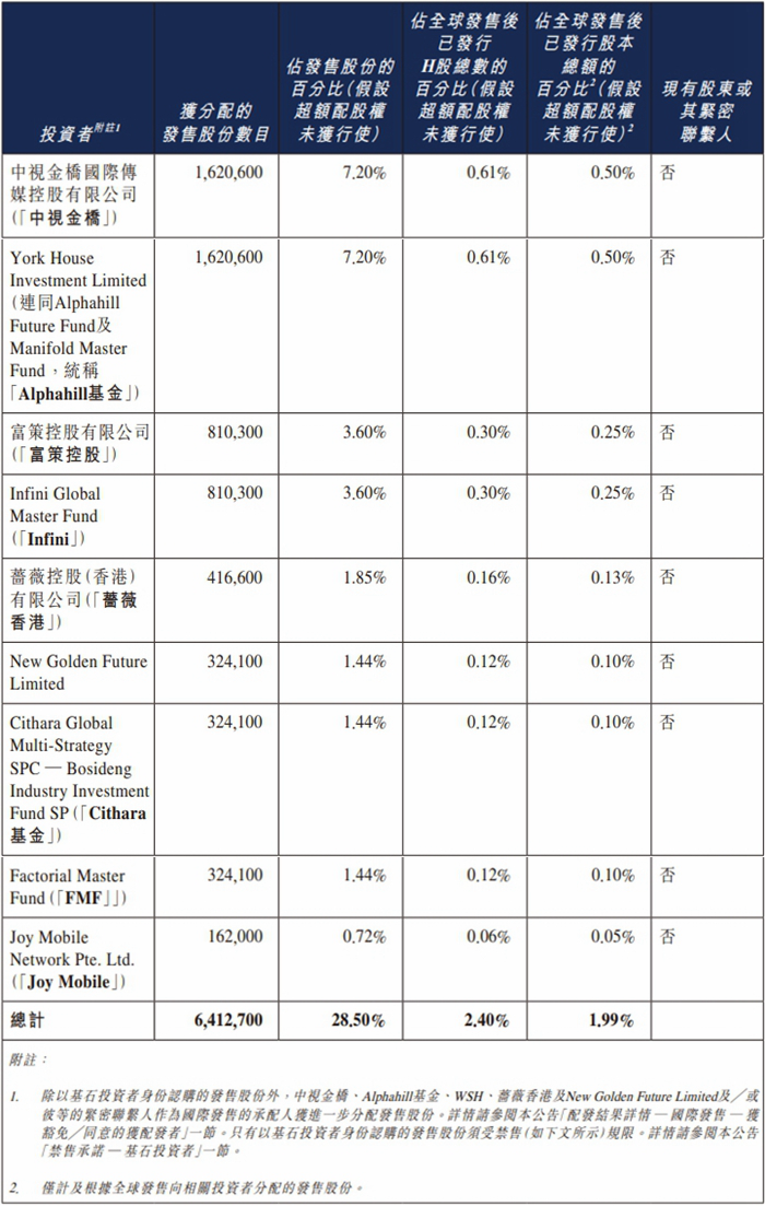 迅策本次发行的基石投资者为中视金桥国际传媒控股有限公司(「中视金桥」)、York House Investment Limited(连同Alphahil lFuture Fund及Manifold Master Fund,统称「Alphahill基金」)、富策控股有限公司(「富策控股」)、Infini Global Master Fund(「Infini」)、蔷薇控股(香港)有限公司(「蔷薇香港」)、New Golden Future Limited、Cithara Global Multi-Strategy SPC — Bosideng Industry Investment Fund SP(「Cithara基金」)、Factorial Master Fund(「FMF」」)、Joy Mobile Network Pte. Ltd.(「Joy Mobile」)。