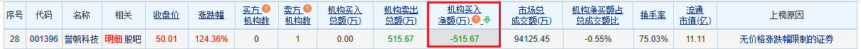 龙虎榜数据显示,卖出誉帆科技金额最大的前五名中,有1家机构专用席位。经统计,机构席位今日卖出誉帆科技净额为515.67万元。
