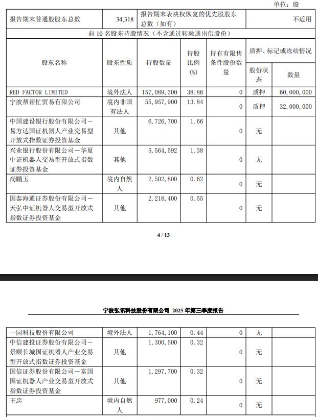 弘讯科技2025年第三季度报告显示,RED和帮帮忙合计质押股份9200万股。
