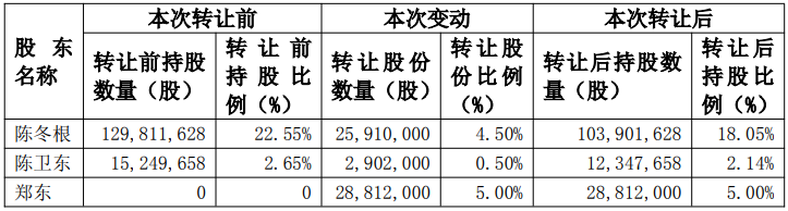 公告显示,标的股份转让价格为9.45元/股,郑东就其本次受让的标的股份应向陈冬根支付含税股份转让款244,849,500元,应向陈卫东支付含税股份转让款27,423,900元。