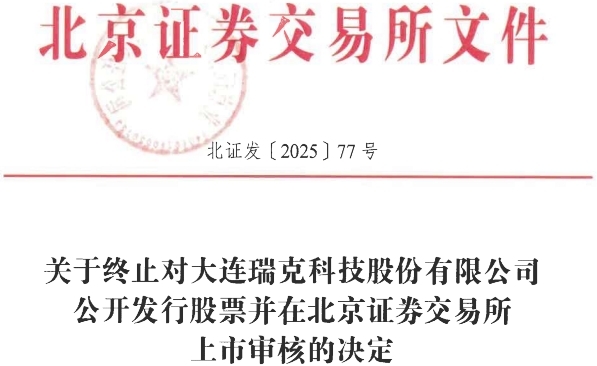 中国经济网北京1月2日讯 北交所网站于2025年12月31日披露关于终止对大连瑞克科技股份有限公司(以下简称“瑞克科技”)公开发行股票并在北京证券交易所上市审核的决定。
