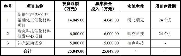 瑞克科技原拟募集资金25,049.00万元,分别用于新增年产2800吨基础化工催化材料项目、瑞克科技催化材料研发中心项目、补充流动资金。