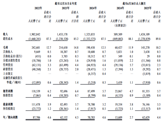 2022年、2023年、2024年12月31日止年度以及截至2024年及2025年6月30日止六个月,美联股份的总收入分别为人民币1,902.8百万元、人民币1,453.2百万元、人民币1,523.0百万元、人民币509.5百万元及人民币1,424.1百万元。年内利润分别为人民币87.7百万元、人民币62.1百万元、人民币70.8百万元、人民币13.6百万元、人民币62.6百万元。