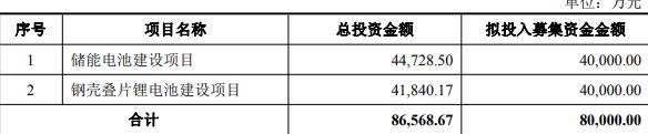 本次向特定对象发行股票的募集资金总额不超过80,000.00万元(含本数),扣除发行费用后的募集资金净额将用于储能电池建设项目、钢壳叠片锂电池建设项目。
