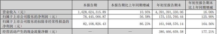 年初至报告期末,公司实现营业收入43.91亿元,同比增长16.06%;归属于上市公司股东的净利润1.75亿元,同比增长125.90%;归属于上市公司股东的扣除非经常性损益的净利润为1.62亿元,同比增长164.56%;经营活动产生的现金流量净额3.80亿元。