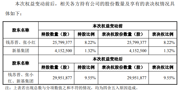 截至公告披露日,公司控股股东、实际控制人钱苏晋、张小红合计持有公司25,799,377股股份,占公司总股本的8.22%;新基集团持有公司4,152,500股股份,占公司总股本的1.32%。上述协议签署后,钱苏晋、张小红及新基集团合计持有公司29,951,877股股份,占公司总股本的9.55%。公司的实际控制人由钱苏晋、张小红变更为钱苏晋、张小红及新基集团。