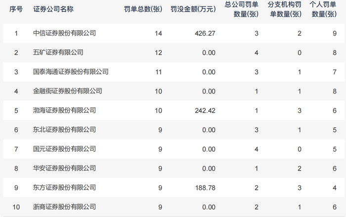 从证券公司罚单排名来看,中信证券受罚较多,罚款数量高达14张。中信证券以14张罚单成为全年受罚次数最多的券商,但罚没金额仅为426.27万元,而东海证券则以一次6000万元的罚没金额成为处罚最重的券商。五矿证券、国泰海通证券等9家券商均以9张及以上罚单进入受罚次数前十名单,其中,7家券商罚没金额为0,主要处罚类型为出具警示函。