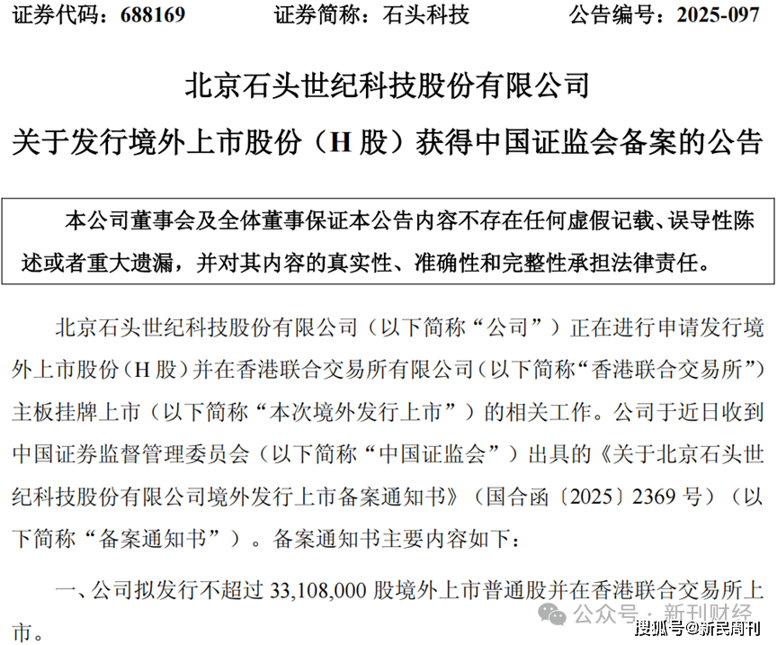 然而,在鲜花着锦的背面,资本市场的聚光灯却照向了另一个角落。2025年12月26日,石头科技宣布收到了中国证监会关于其发行境外上市股份(H股)的备案通知书,这是继2025年6月首次递表失效后,石头科技在半年内第二次向港交所发起冲锋。