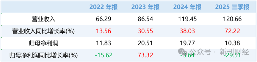 财报数据显示,公司在近几年实现快速营收增长,2022至2024年公司营收由约66.29亿元增至119.45亿元,2025年前三季度达到120.66亿元,甚至已超过2024年全年,但归母净利润却像过山车一样,在2023年实现超高速增长,却在2022、2024和2025三度下滑。