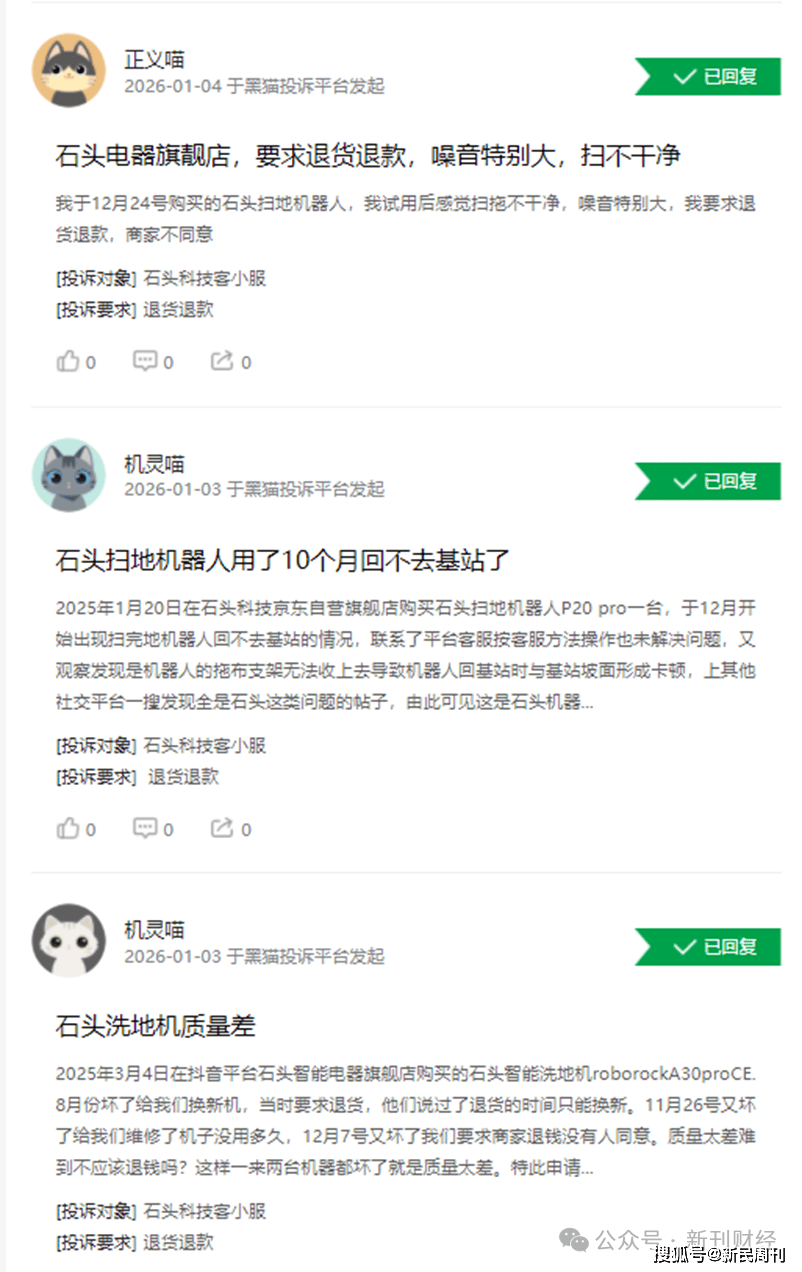 截至2016年1月5日,在黑猫投诉等平台上,有2140起针对石头科技的投诉,而完成率只有76%。关于产品清洁效果不佳、噪音大、有异味、无法回站等问题的投诉屡见不鲜。尤其是在其试图打造“高端品牌”的当下,产品定价动辄四五千元,但交付给用户的体验却未能完全匹配这一身价。