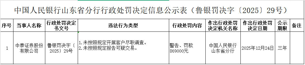 中国经济网北京1月8日讯 中国人民银行网站2025年12月31日发布山东省分行行政处罚决定信息公示表(鲁银罚决字〔2025〕29号)。中泰证券股份有限公司(简称:中泰证券,600918.SH)存在以下违法行为:1.未按照规定开展客户尽职调查;2.未按照规定报告可疑交易。中国人民银行山东省分行决定对其处以警告、罚款869000元。