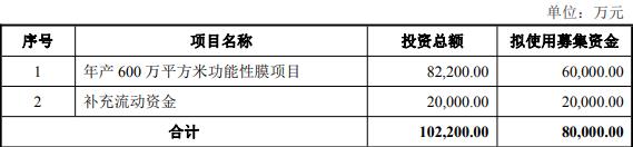 本次向特定对象发行A股股票募集资金总金额不超过80,000.00万元(含本数),本次募集资金总额在扣除发行费用后的净额将用于年产600万平方米功能性膜项目、补充流动资金。