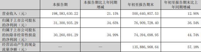 年初至报告期末,公司实现营业收入5.01亿元,同比增长12.90%;归属于上市公司股东的净利润7690.97万元,同比增长36.54%;归属于上市公司股东的扣除非经常性损益的净利润为7439.47万元,同比增长44.74%;经营活动产生的现金流量净额1.36亿元。
