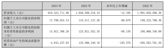 2022年至2024年,全信股份营业收入分别为10.92亿元、10.37亿元、9.10亿元,归属于上市公司股东的净利润分别为1.89亿元、1.34亿元、0.18亿元。