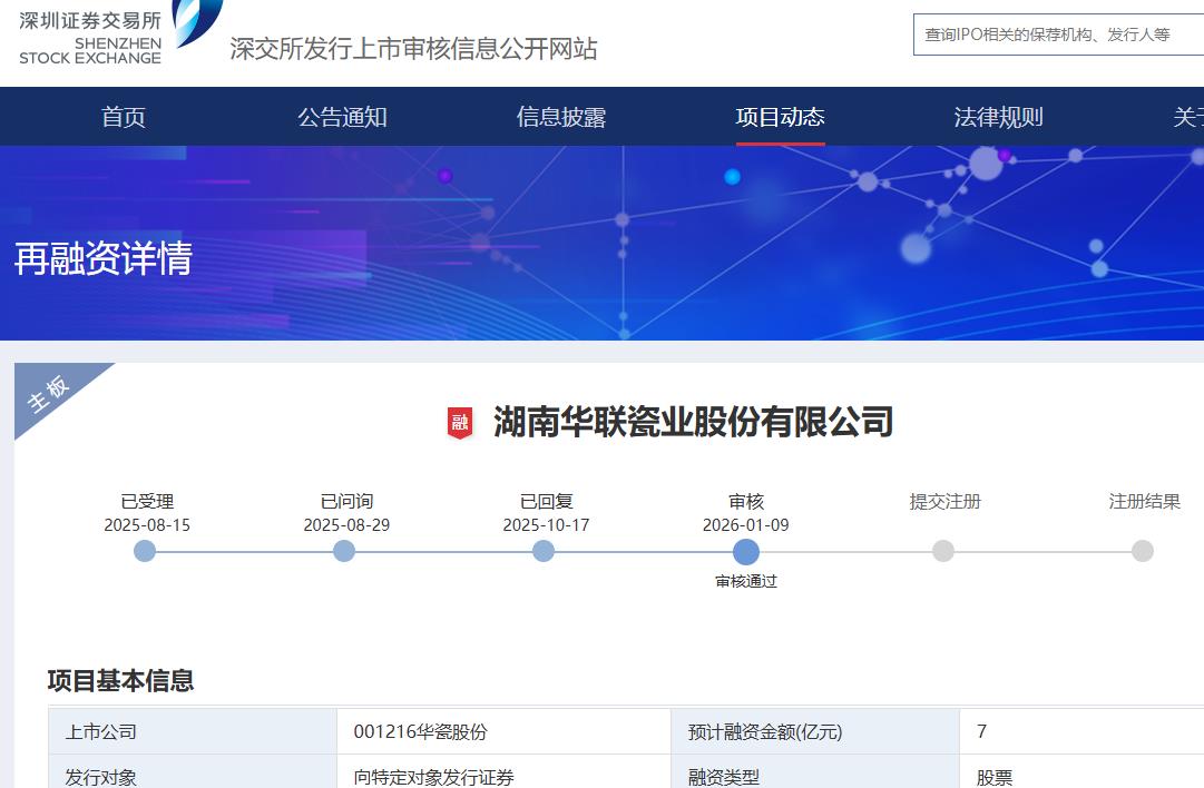 中国经济网北京1月12日讯 华瓷股份(001216.SZ)向特定对象发行证券事项9日获得深交所审核通过。