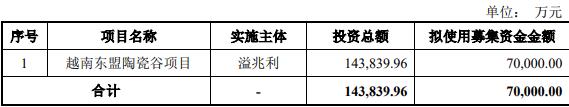本次发行募集资金总额不超过70,000.00万元(含),扣除发行费用后拟用于越南东盟陶瓷谷项目。