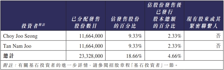 BBSB INTL本次发行的基石投资者为Choy Joo Seong、Tan Nam Joo。