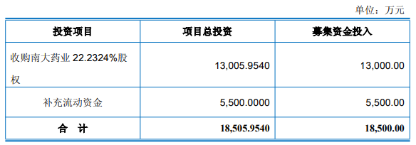 艾迪药业昨晚披露的2026年度以简易程序向特定对象发行A股股票预案显示,公司本次发行募集资金总额不超过(含)18,500.00万元,符合以简易程序向特定对象发行股票的募集资金总额不超过人民币三亿元且不超过最近一年末净资产百分之二十的规定;扣除发行费用后的募集资金净额将用于收购南大药业22.2324%股权和补充流动资金,拟投入募集资金分别为13,000.00万元和5,500.00万元。