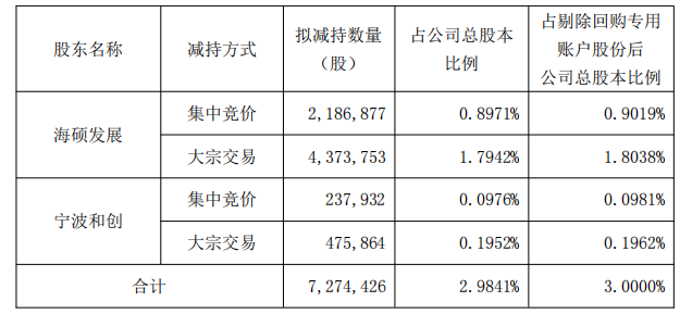海硕发展、宁波和创计划自公告披露之日起15个交易日后的3个月内,合计减持公司股份不超过7,274,426股,占公司总股本的2.9841%,占剔除公司回购专用账户股份后总股本的3.0000%,其中,以集中竞价方式减持公司股份不超过2,424,809股,占公司总股本的0.9947%,占剔除公司回购专用账户股份后总股本的1.0000%,以大宗交易方式减持公司股份不超过4,849,617股,占公司总股本的1.9894%,占剔除公司回购专用账户股份后总股本的2.0000%。