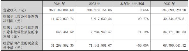 2024年,公司实现营业收入3.60亿元,同比减少8.65%;归属于上市公司股东的净利润1157.28万元,同比增长29.77%;归属于上市公司股东的扣除非经常性损益的净利润为-64.55万元,2023年为-223.49万元;经营活动产生的现金流量净额3126.86万元。
