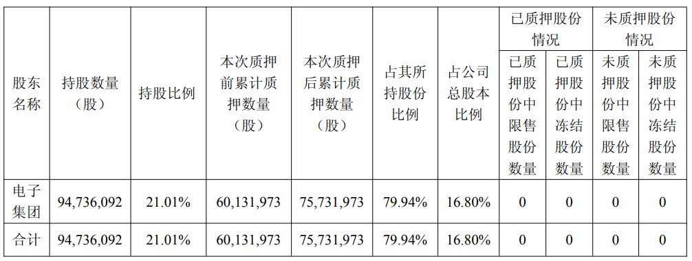 电子集团因偿还质押借款及自身经营发展需要,计划通过大宗交易方式减持公司股份不超过 9,017,769 股,即不超过公司总股本的 2%。减持价格将按照减持实施时的市场价格确定。截至公告披露日,电子集团持有公司94,736,092股股份,占公司总股本的比例为 21.01%。