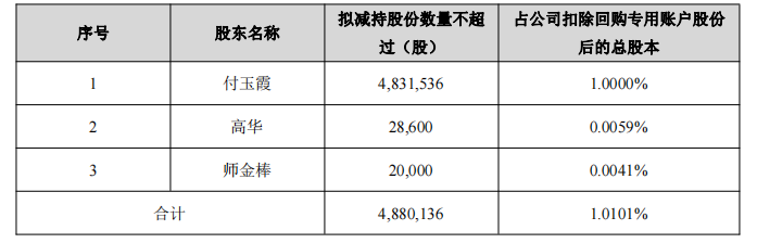 持有公司股份80,000股(占公司扣除回购专用账户股份后的总股本比例0.0166%)的副总经理师金棒计划在减持计划公告披露之日起十五个交易日后的三个月内以集中竞价方式减持公司股份不超过20,000股(占公司扣除回购专用账户股份后的总股本比例0.0041%)。