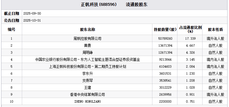 截至2025年9月30日,正帆科技前十大流通股股东中,中国农业银行股份有限公司-东方人工智能主题混合型证券投资基金持有3.145%流通股,为第4大流通股股东。