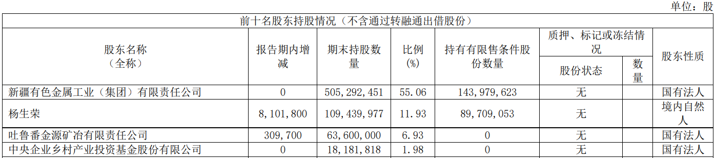 公司控股股东新疆有色金属工业(集团)有限责任公司(简称“新疆有色”)自减持计划公告之日起十五个交易日后的三个月内,计划通过证券交易所以集中竞价交易方式减持股份数量合计不超过9,109,991股,减持比例不超过公司总股本的1%。截至公告披露日,新疆有色持有公司500,948,948股无限售流通股,占公司总股本的54.99%。