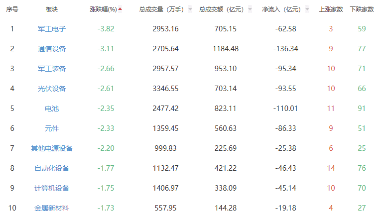 板块方面,贵金属、化学原料、房地产等板块涨幅居前,军工电子、通信设备、军工装备等板块跌幅居前。