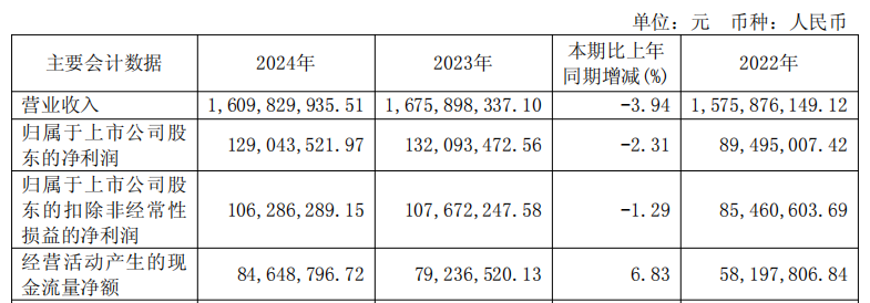 2024年,公司实现归属于上市公司股东的净利润1.29亿元,同比减少2.31%;实现归属于上市公司股东的扣除非经常性损益的净利润1.06亿元,同比减少1.29%。