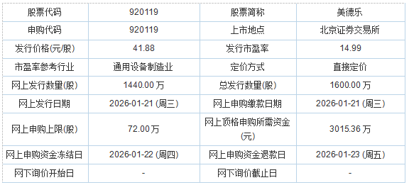 美德乐2026年1月19日披露的向不特定合格投资者公开发行股票并在北京证券交易所上市发行公告显示,若本次发行成功,预计公司募集资金总额67,008.00万元,扣除发行费用6,181.28万元(不含增值税)后,预计募集资金净额为60,826.72万元(如存在尾数差异,为四舍五入造成)。