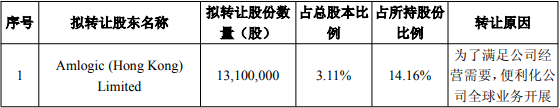 Amlogic (Hong Kong) Limited于2023年5月19日、2023年6月29日通过大宗交易分别减持3,678,195股、1,892,700股人民币普通股股份,分别占公司当时总股本的0.89%、0.45%;于2024年7月4日、2025年2月7日通过询价转让分别减持公司12,479,096股、16,330,657股人民币普通股股份,分别占公司当时总股本的2.98%、3.90%。