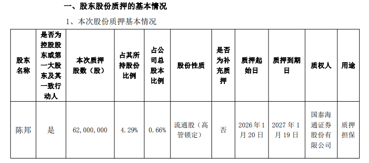 本次质押股数为6200万股,占其所持股份比例为4.29%,占公司总股本比例为0.66%,股份性质为流通股(高管锁定),质押起始日为2026年1月20日,到期日为2027年1月19日,质权人为国泰海通证券股份有限公司,用途为质押担保。