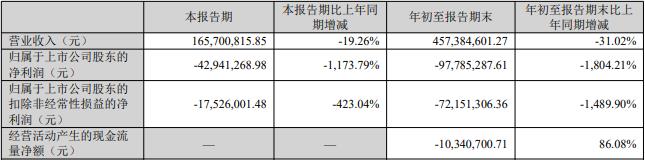 据公司2025年第三季度报告,本报告期,公司实现营业收入1.66亿元,同比减少19.26%;归属于上市公司股东的净利润-4294.13万元;扣除非经常性损益后的净利润-1752.60万元。年初至报告期末,公司实现营业收入4.57亿元,同比减少31.02%;归属于上市公司股东的净利润-9778.53万元;扣除非经常性损益后的净利润-7215.13万元,经营活动产生的现金流量净额-1034.07万元。