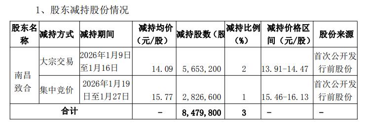 公司近日收到南昌致合出具的《关于股东股份减持计划实施完成的告知函》,获悉南昌致合于2026年1月9日至1月27日分别通过集中竞价方式减持公司股份2,826,600股,占总股本1%;通过大宗交易方式减持公司股份5,653,200股,占总股本的2%;合计减持股份8,479,800股,占公司总股本的3%,南昌致合持有公司股份比例从18.18%下降至15.18%。