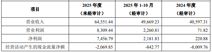 2024年度、2025年度,长兴半导体营业收入分别为40,597.31万元、64,551.44万元,净利润分别为220.88万元、7,456.79万元,经营活动产生的现金流量净额分别为-8,009.76万元、-2,069.85万元。