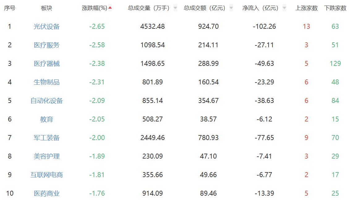 板块方面,贵金属、油气开采及服务、工业金属等板块涨幅居前,光伏设备、医疗服务、医疗器械等板块跌幅居前。